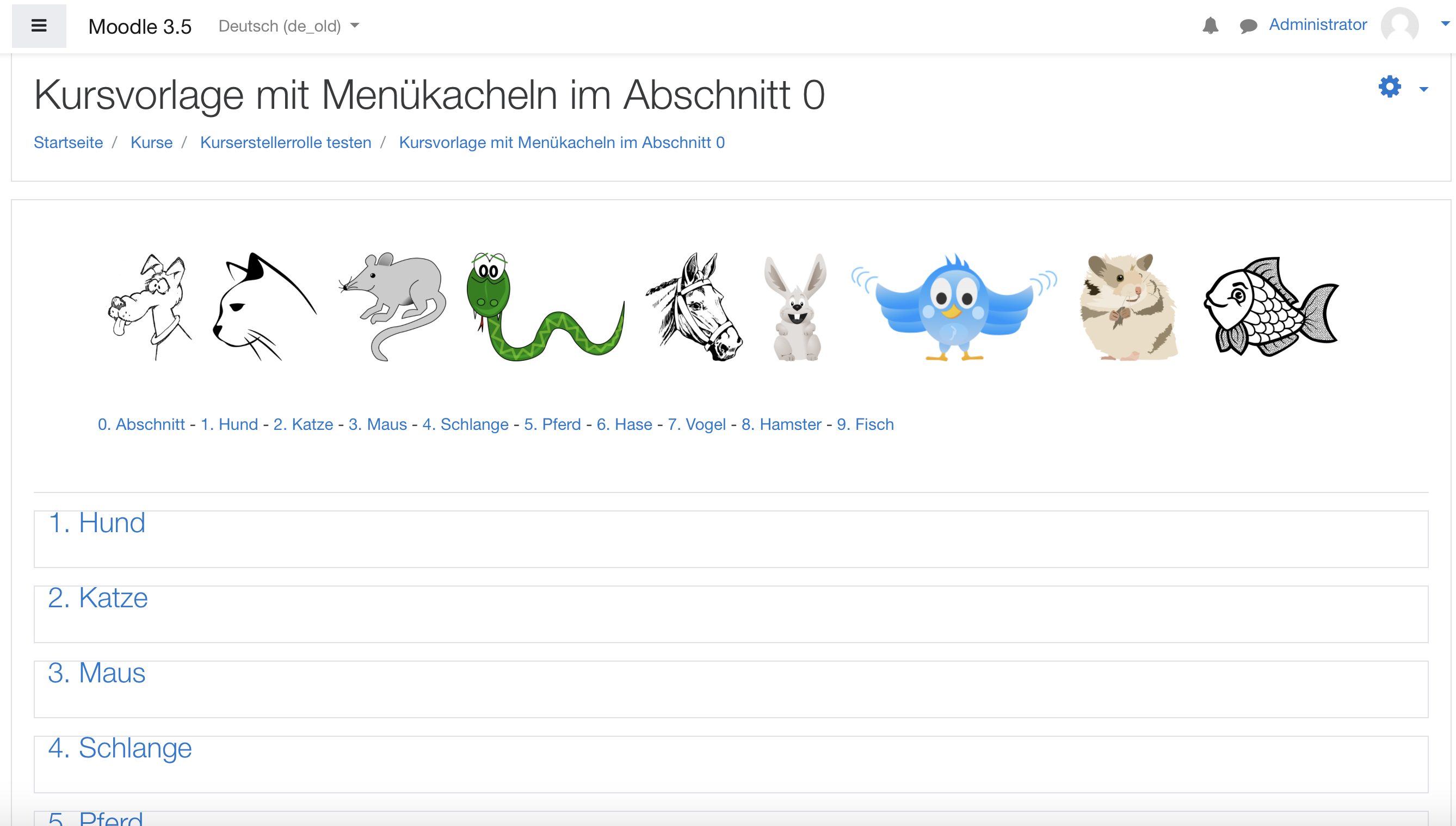 Dies ist eine Kursvorlage in der sich im oberen Abschnitt Nr. 0 insgesamt 9 Icons befinden, die als Link zu den einzelnen Themenabschnitten eingerichtet sind. Die Bilder können gegen eigene Bilder für den jeweiligen Anwendungsbedarf ausgetauscht werden und so schnell ein Kurs mit "Kachelnavigation" im oberen Abschnitt erstellt werden.