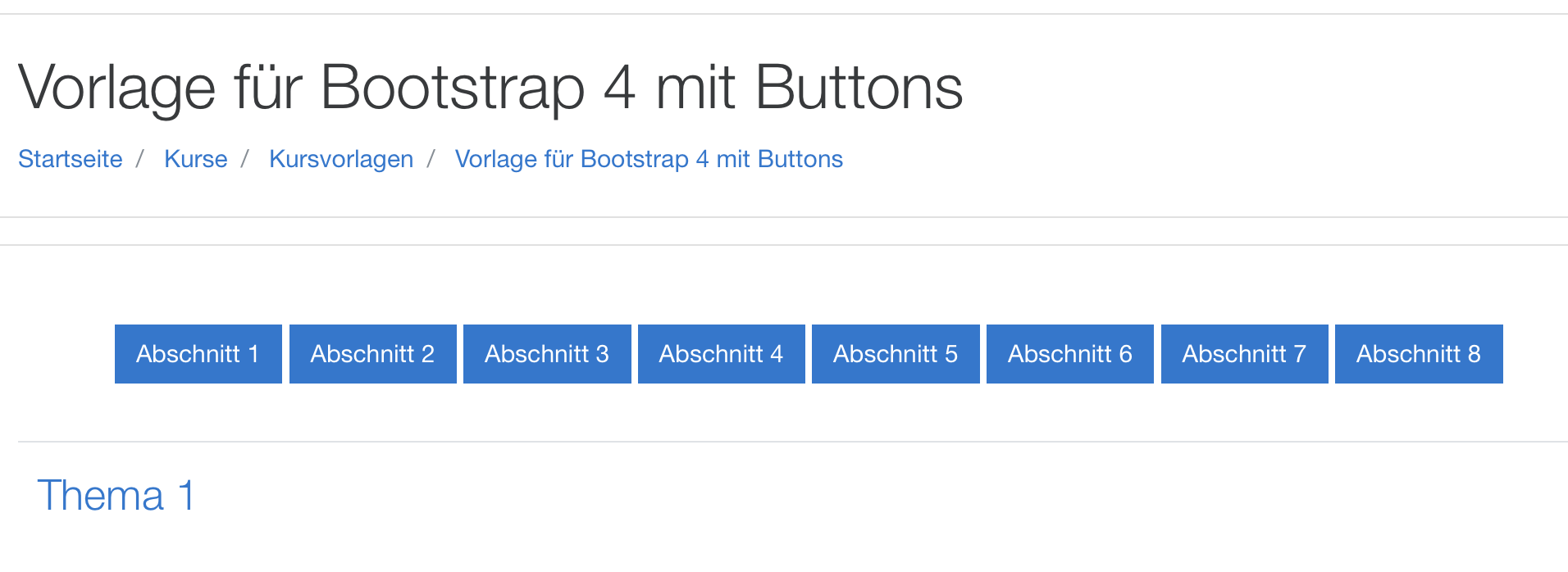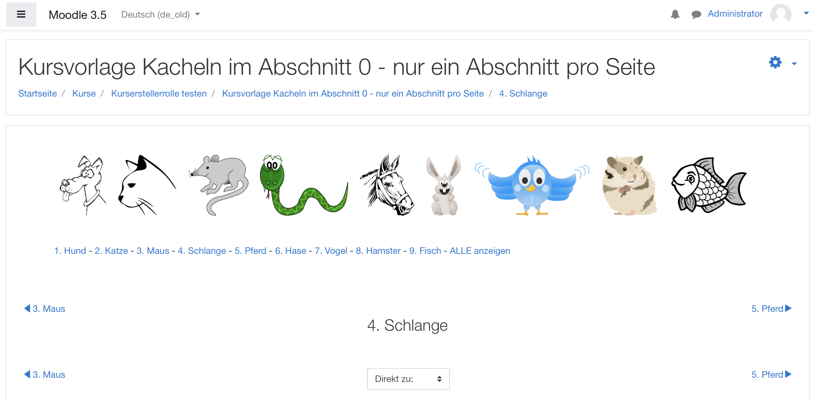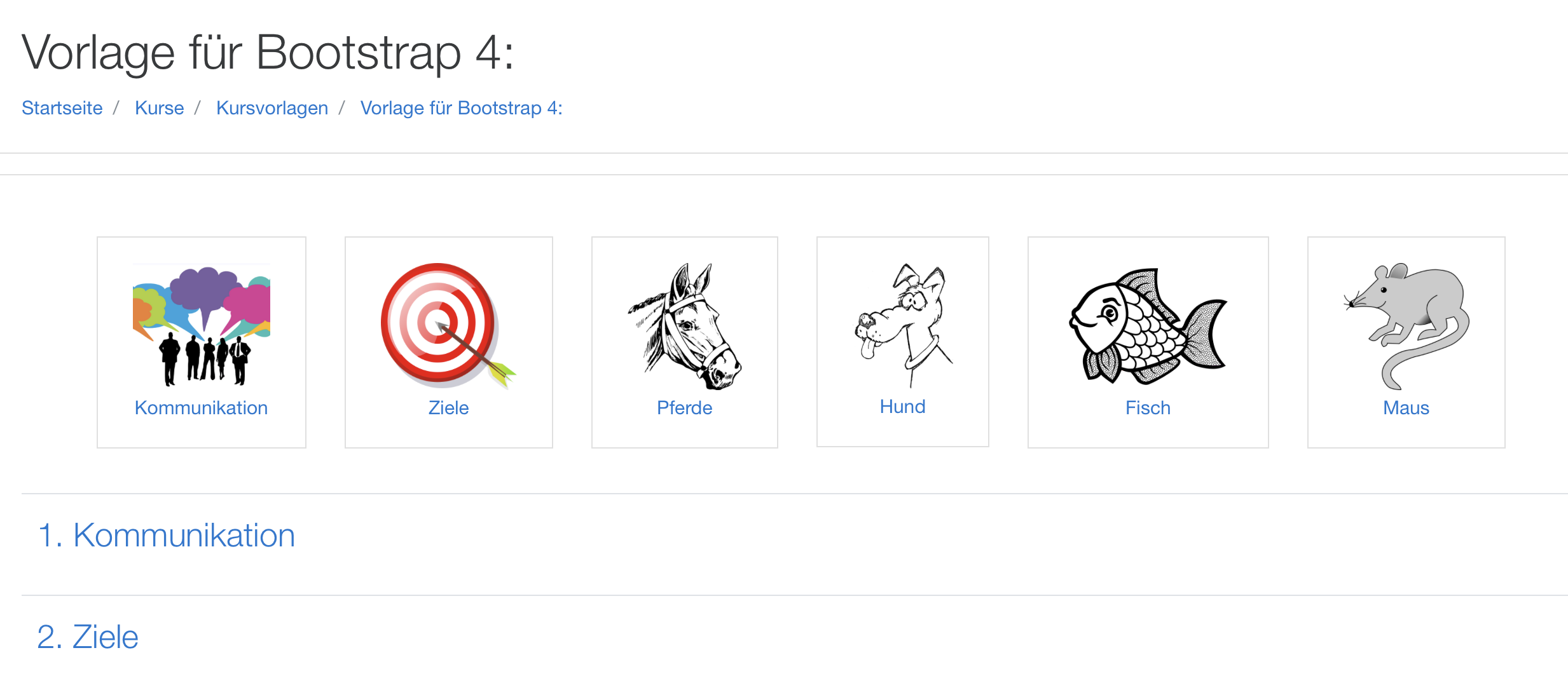Dies ist eine Kursvorlage in der sich im oberen Abschnitt Nr. 0 insgesamt 9 Icons befinden, die als Link zu den einzelnen Themenabschnitten eingerichtet sind. Die Bilder können gegen eigene Bilder für den jeweiligen Anwendungsbedarf ausgetauscht werden und so schnell ein Kurs mit "Kachelnavigation" im oberen Abschnitt erstellt werden. Die Links sind so erstellt, dass nur ein Themenabschnitt je Seite angezeigt wird.